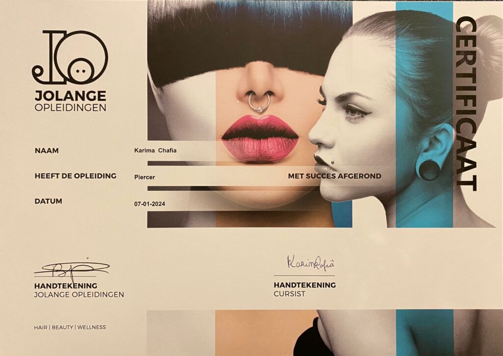 Mijn naam is Karima Chafia en sinds Januari 2024 werk ik op Vrijdag (13.00-19.00) en Zaterdag (10.00-16.00) als “gecertificeerd” piercer bij studio Skink.